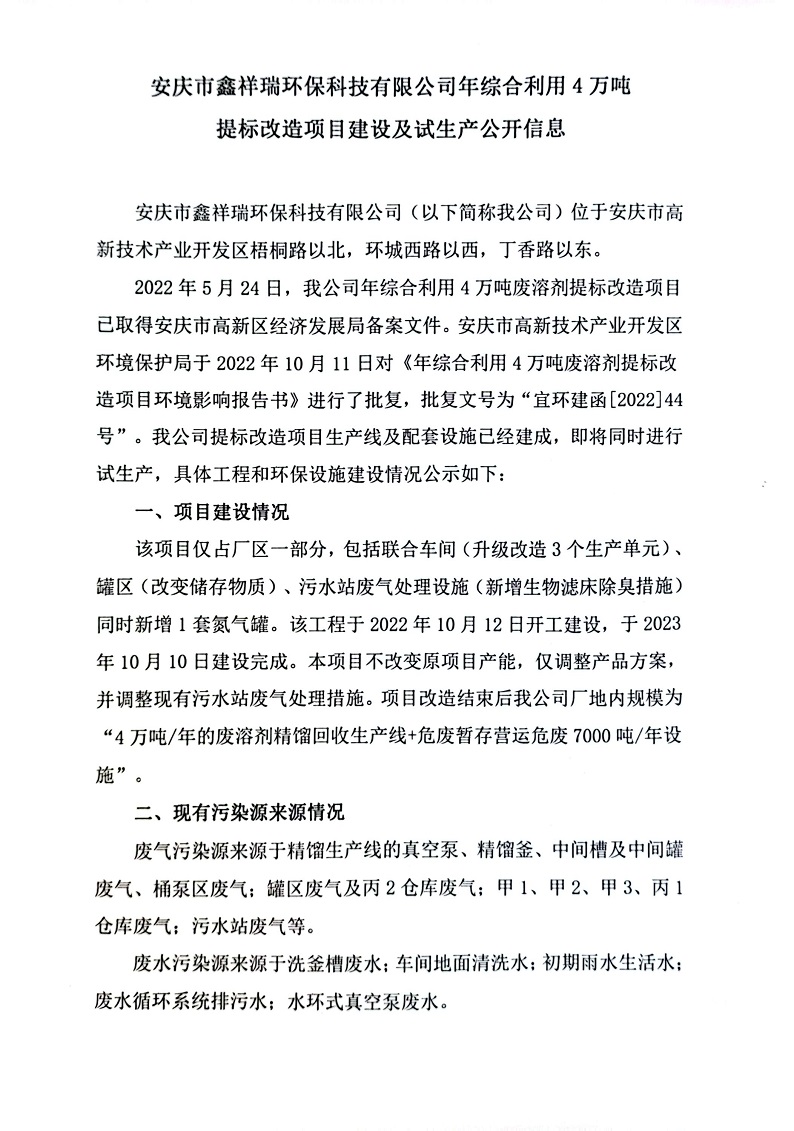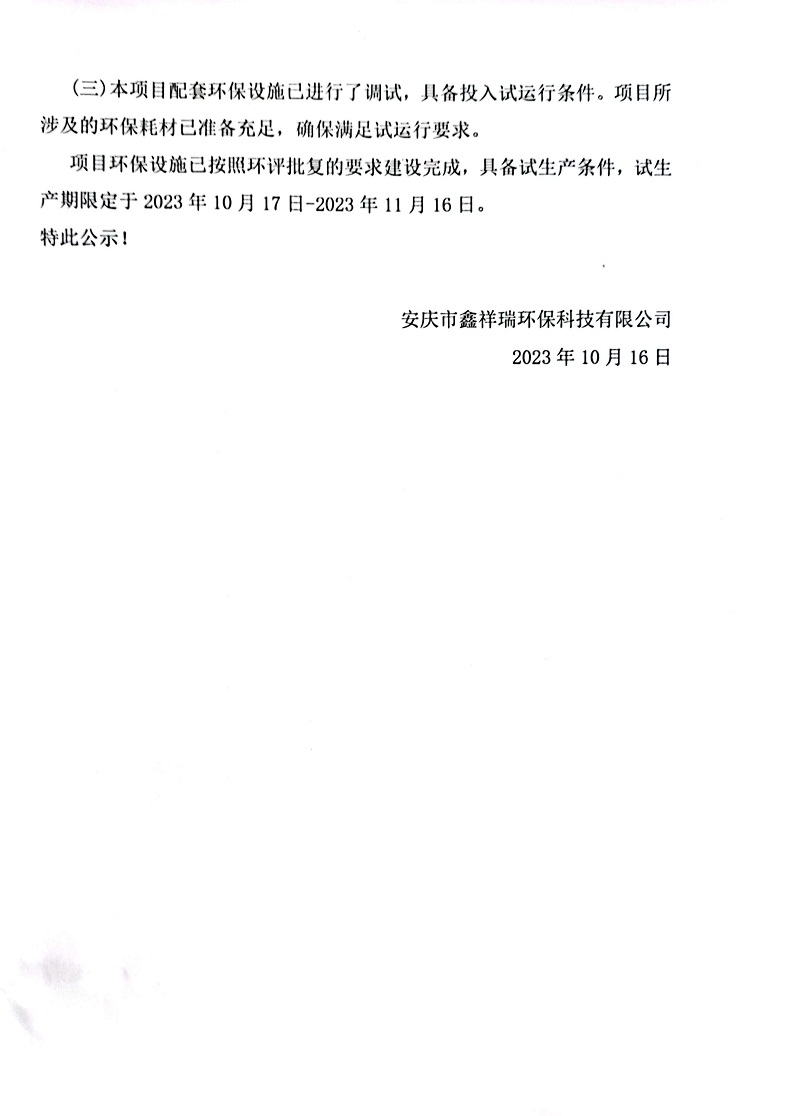 安慶市鑫祥瑞環(huán)??萍加邢薰灸昃C合利用4萬噸提標改造項目建設及試生產(chǎn)公開信息